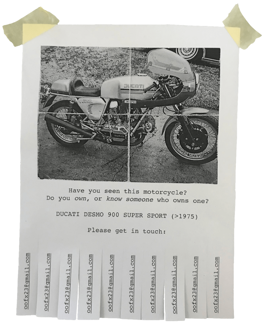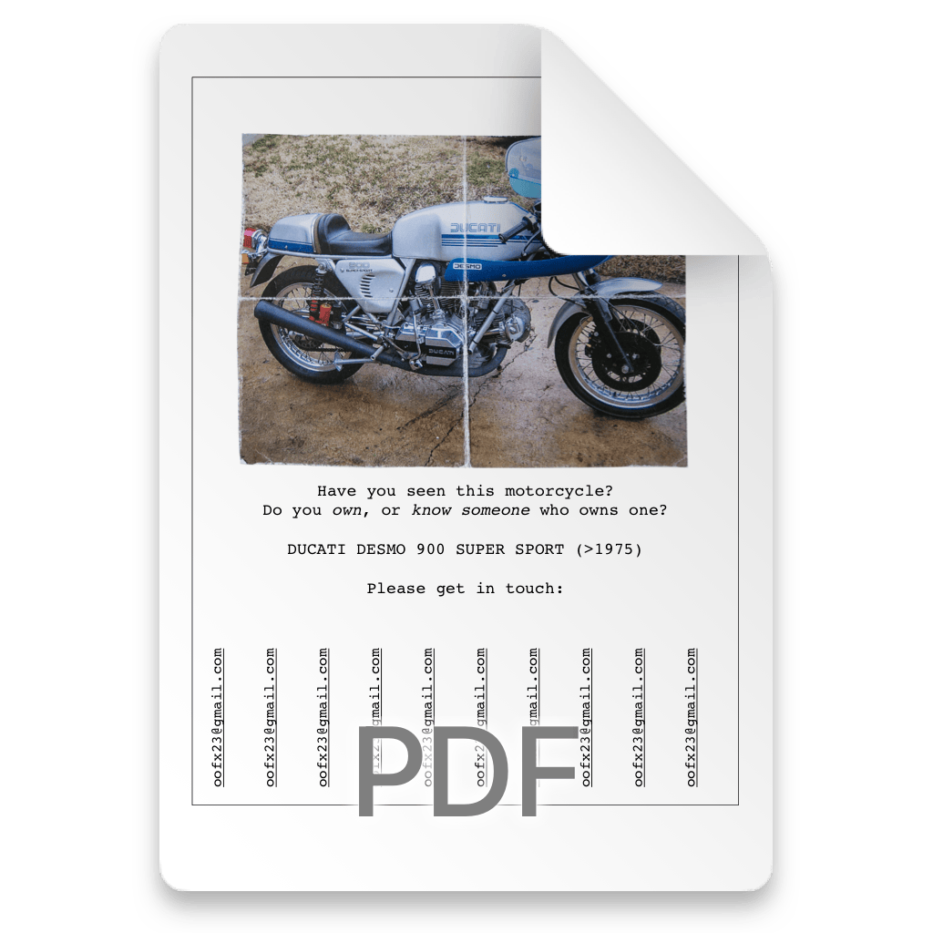 Hey Rocco, how are you? You seem to be a motorcycle enthusiast! I am looking for a Ducati 900 Desmo Super Sport from 1976. Do you know anyone who might own this particular bike?